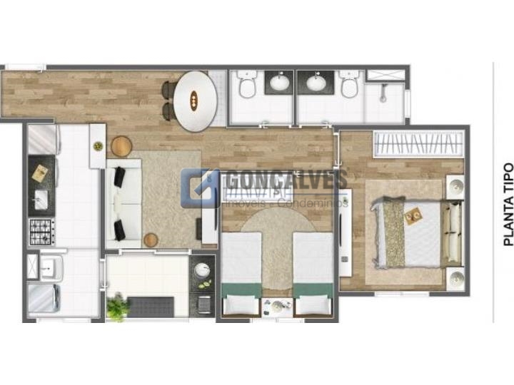 Apartamento com 60M², 02 dormitórios com piso porcelanato,