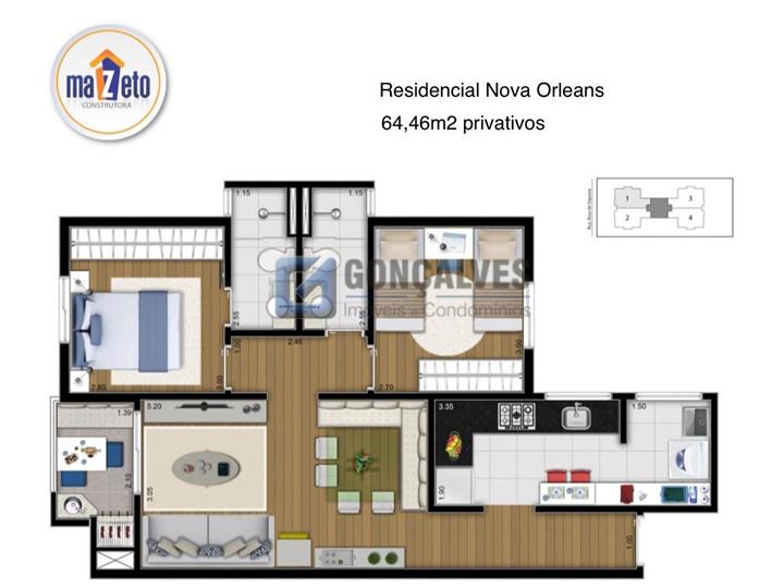 Ótima oportunidade de morar em Santo André, no bairro Campestre. Apartamento residencial de 65 m², com 2 quartos (1 suíte), 2 banheiros, sala 2 ambientes com varanda gourmet, cozinha, área de serviço, áreas frias com piso azulejo e gesso e 1 vaga de garagem. Elevadores (2), infraestrutura completa: academia, piscina, quadra poliesportiva, sala de jogos, churrasqueira, playground e salão de festas. Localização estratégica próxima ao referência 1.
