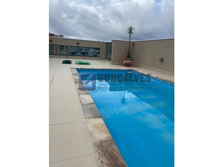 Condomínio com salão de festas, área gourmet e piscina na cobertura.